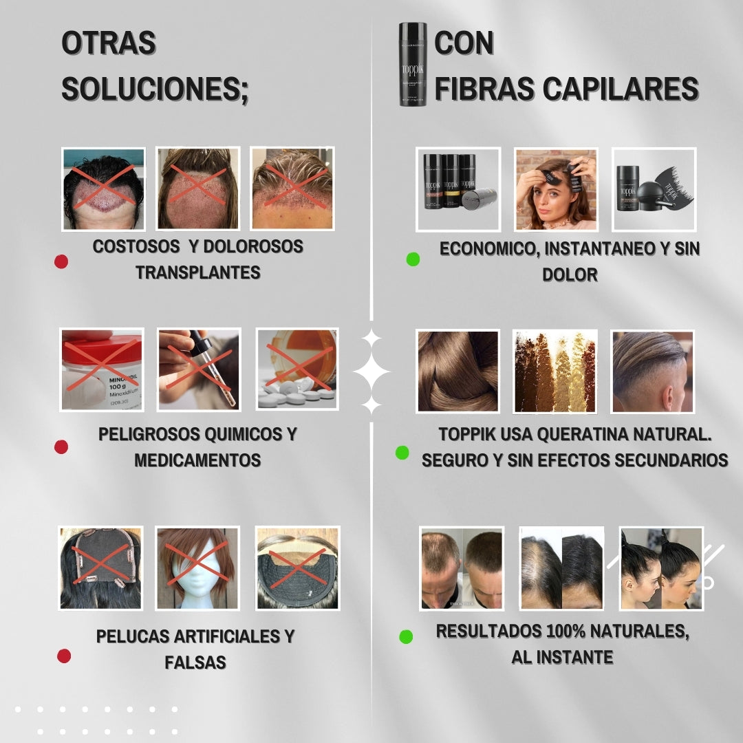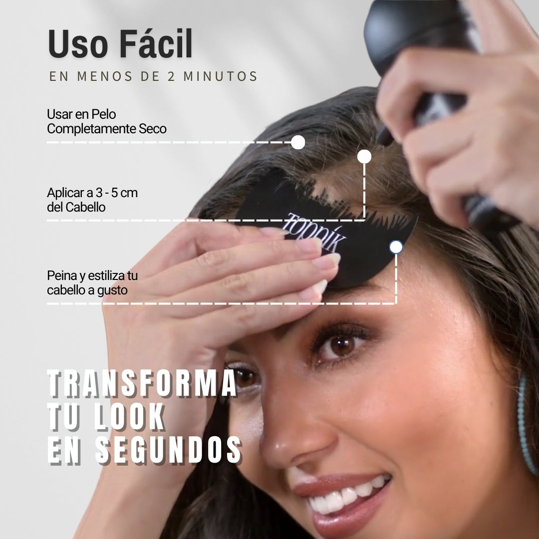 Toppik es la solución perfecta para transformar tu cabello al instante. Con fibras naturales de alta calidad, cubre áreas finas, dándote un look voluminoso, denso y totalmente natural que dura todo el día.